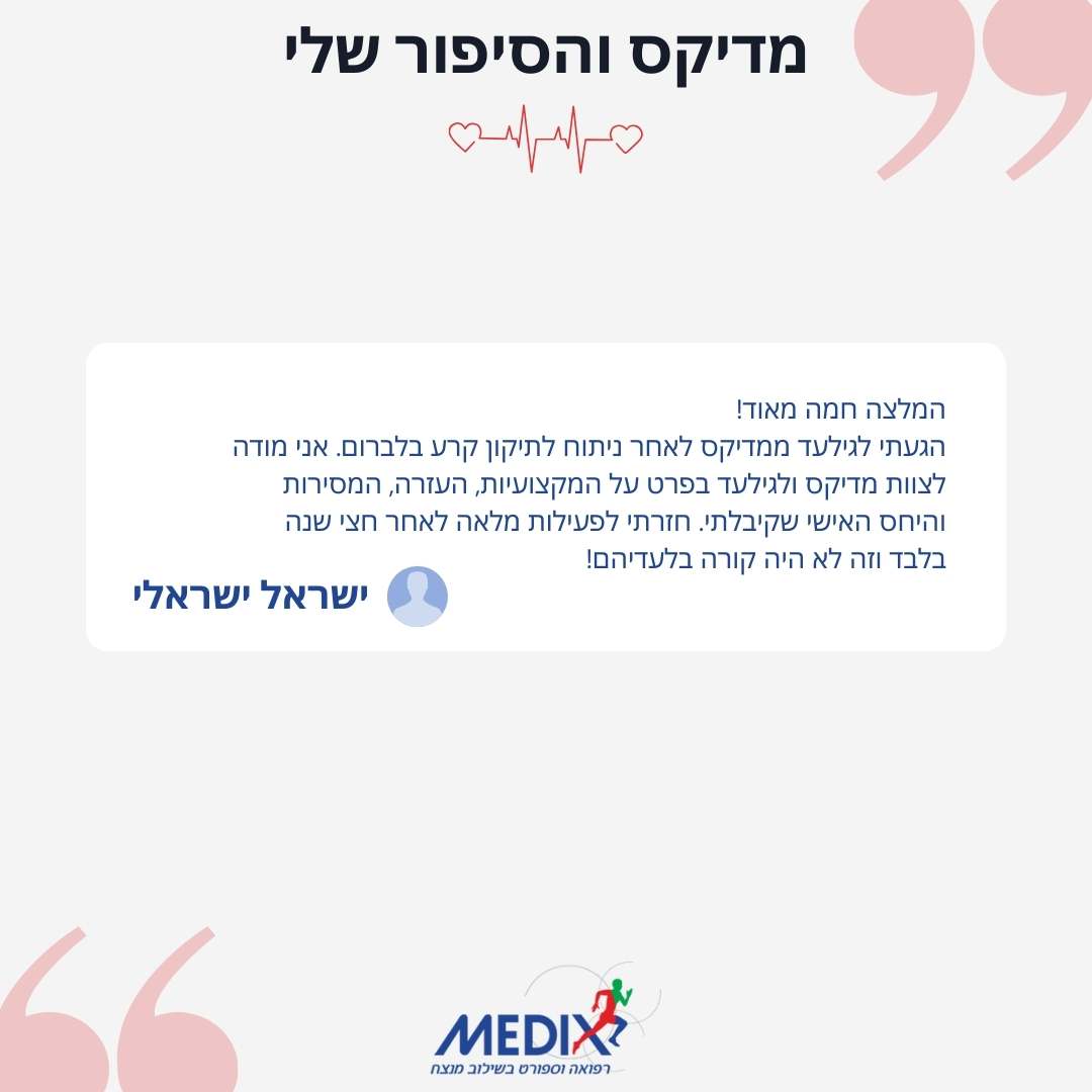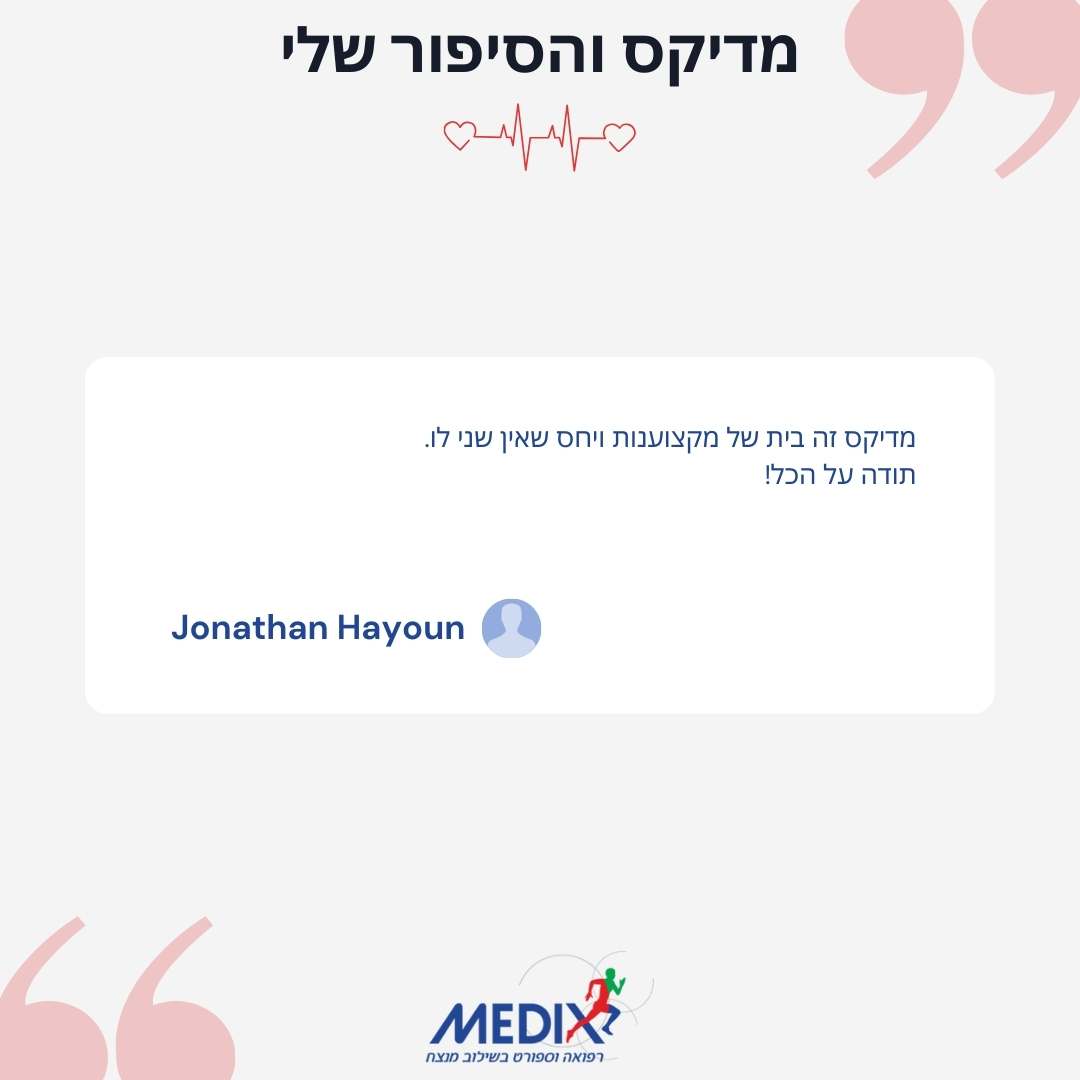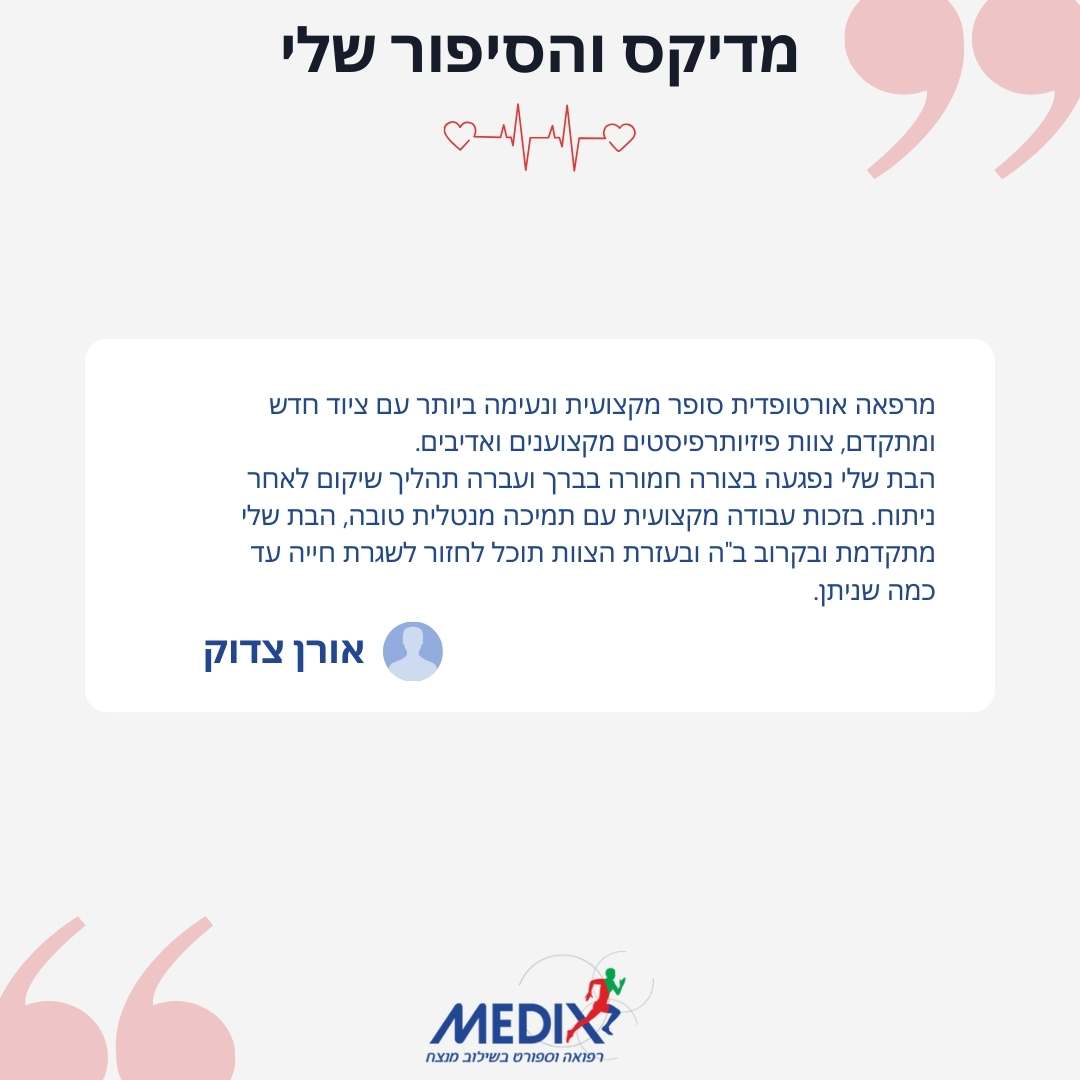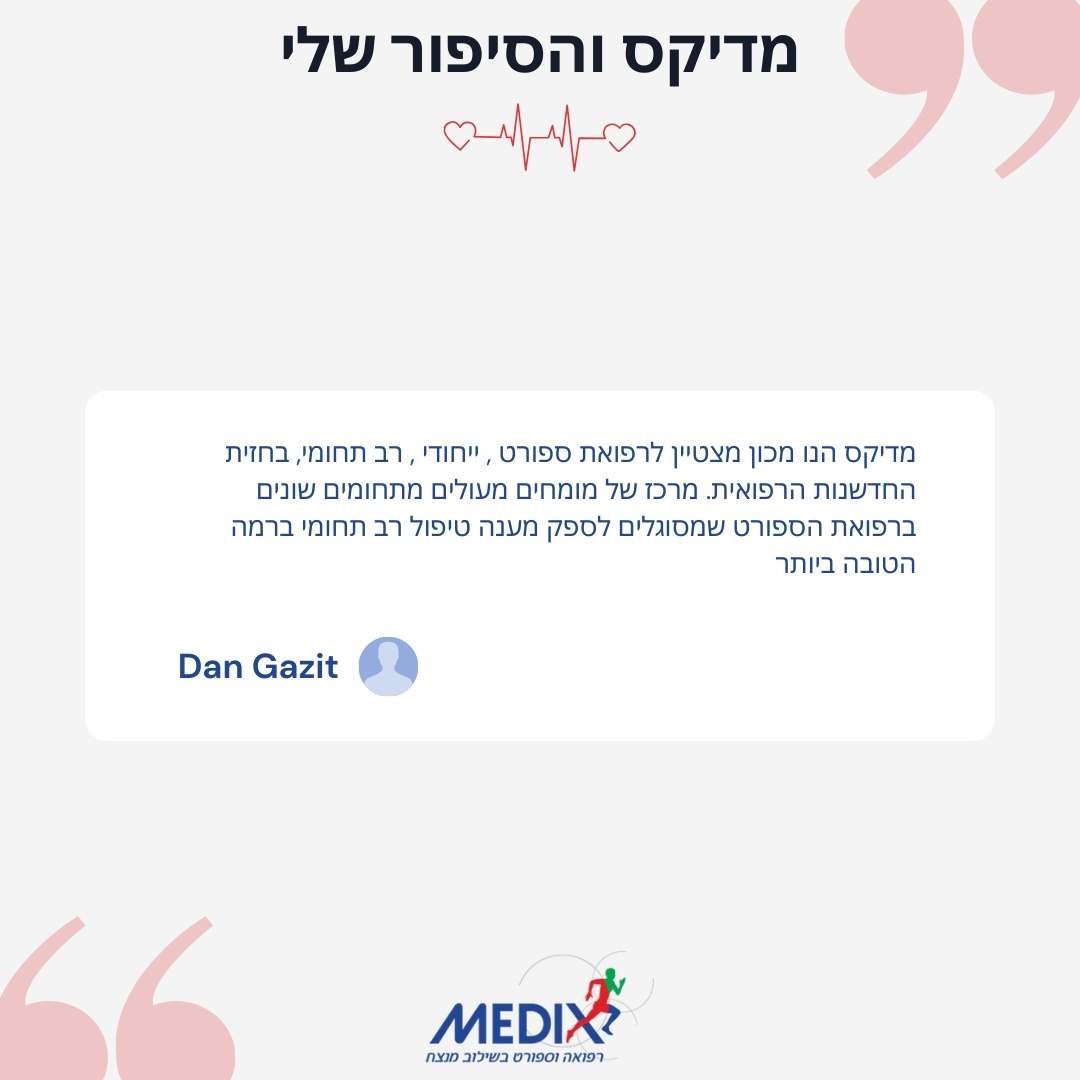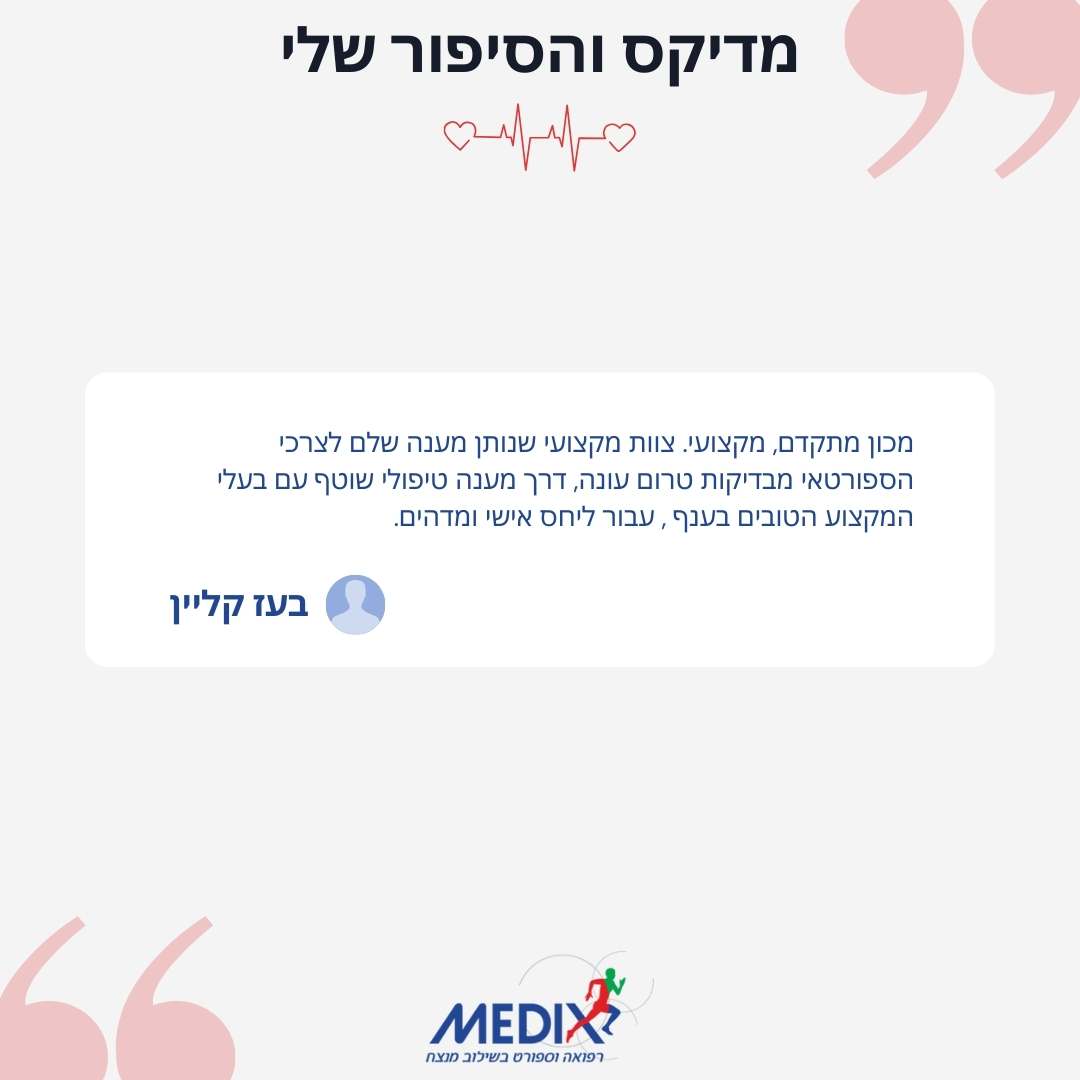 מדיקס הוא המרכז המוביל בישראל לרפואת ספורט ופיזיותרפיה. מאז 2006, אנו מספקים שירותים רפואיים מותאמים אישית לספורטאים מקצועיים וחובבים, במטרה להחזיר את כולם לשגרת החיים והספורט במהרה. במדיקס תמצאו את המומחים המובילים בתחום הרפואה הספורטיבית, עם שירותים בשיתוף פעולה מלא בין תחומי האבחון, הטיפול והשיקום. המרכז שלנו משרת אלפי ספורטאים, כולל חברי נבחרות ישראל, ספורטאים אולימפיים וספורטאים חובבים, לצד טיפול במגוון בעיות אורתופדיות.