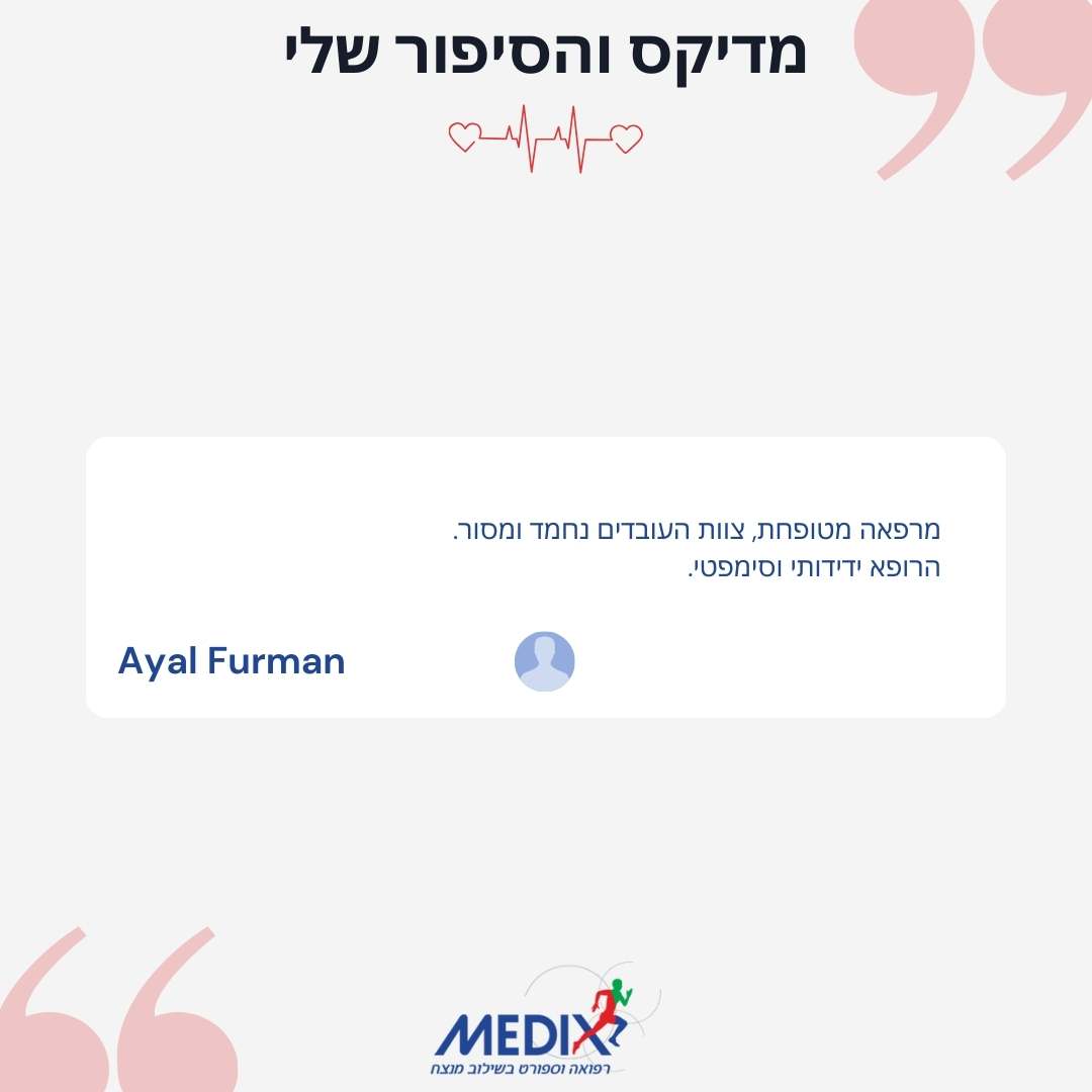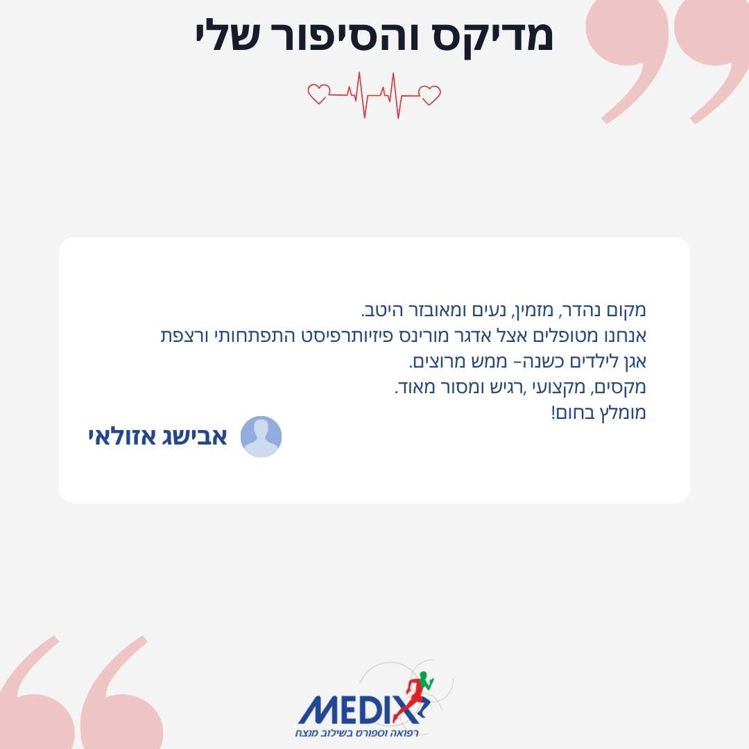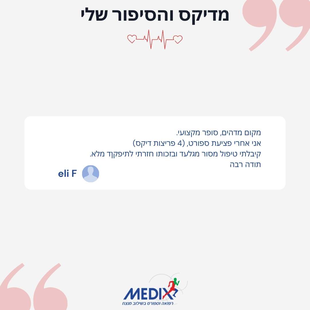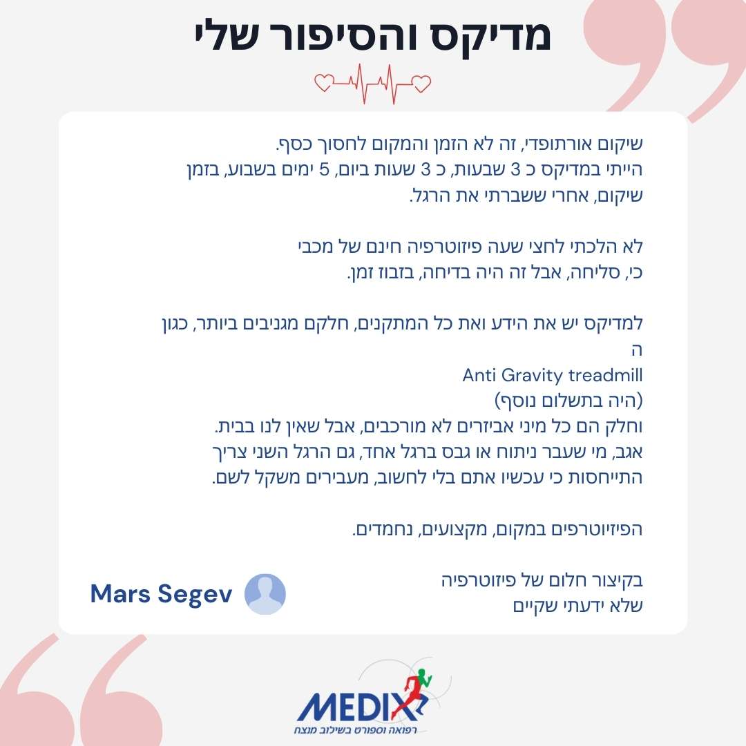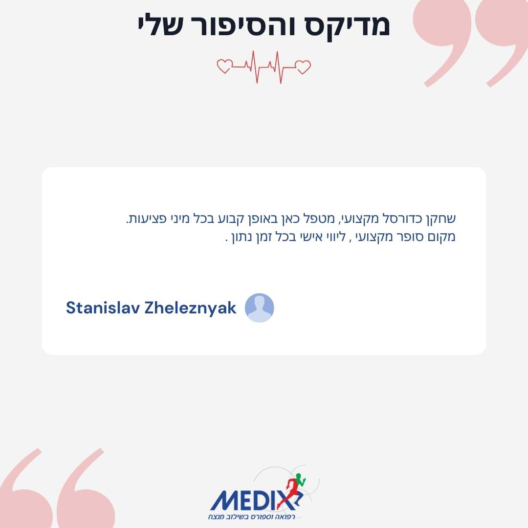 מדיקס הוא המרכז המוביל בישראל לרפואת ספורט ופיזיותרפיה. מאז 2006, אנו מספקים שירותים רפואיים מותאמים אישית לספורטאים מקצועיים וחובבים, במטרה להחזיר את כולם לשגרת החיים והספורט במהרה. במדיקס תמצאו את המומחים המובילים בתחום הרפואה הספורטיבית, עם שירותים בשיתוף פעולה מלא בין תחומי האבחון, הטיפול והשיקום. המרכז שלנו משרת אלפי ספורטאים, כולל חברי נבחרות ישראל, ספורטאים אולימפיים וספורטאים חובבים, לצד טיפול במגוון בעיות אורתופדיות.